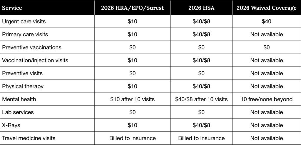 Costs and availability of the services offered at the T-Mobile Onsite Health Center depend on your health plan coverage. See details in the table below.